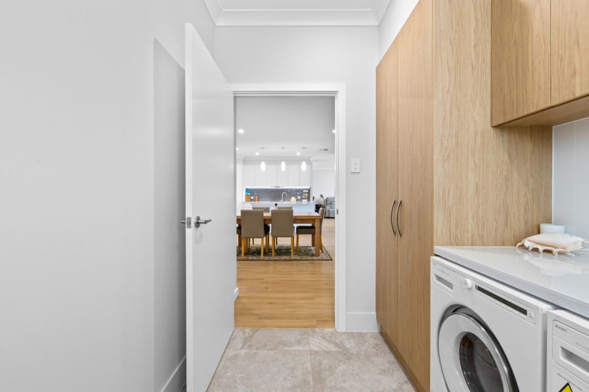 A clean, contemporary Laundry with custom Cabinetry, easy-clean surfaces, and a spacious Benchtop, blending function and modern design.