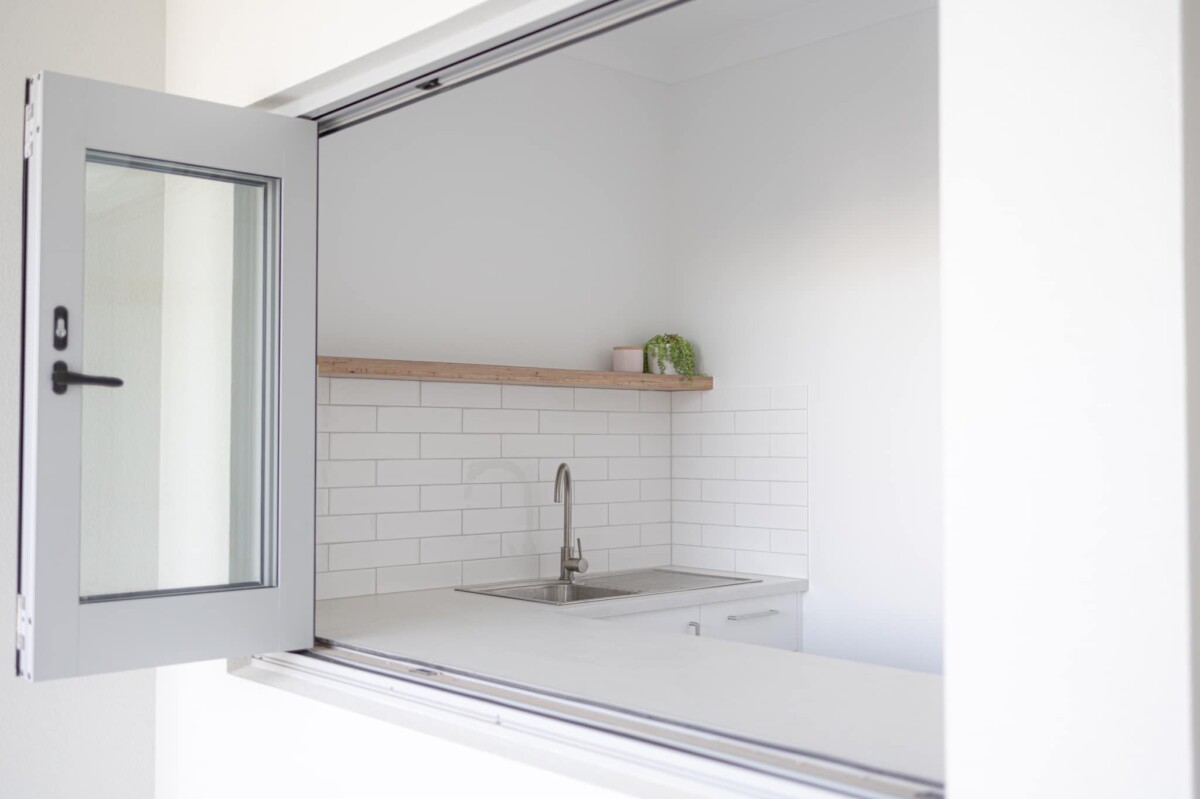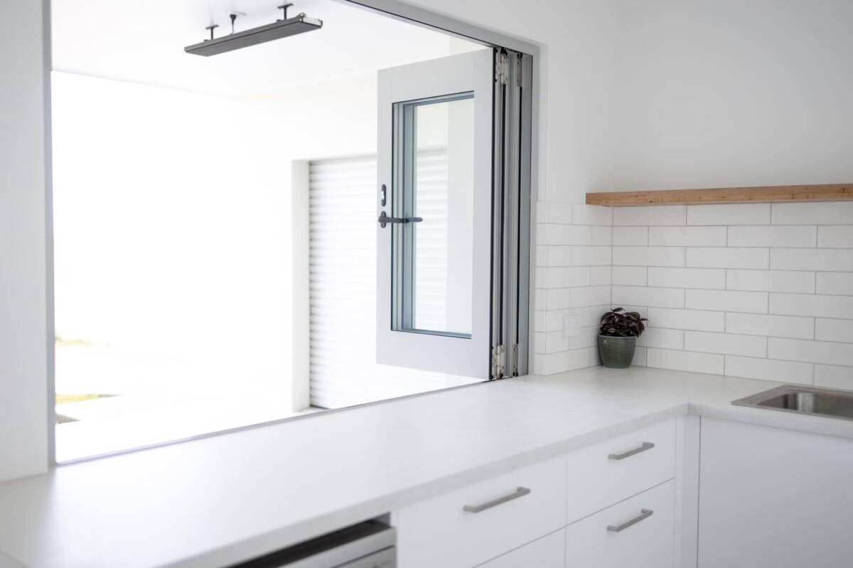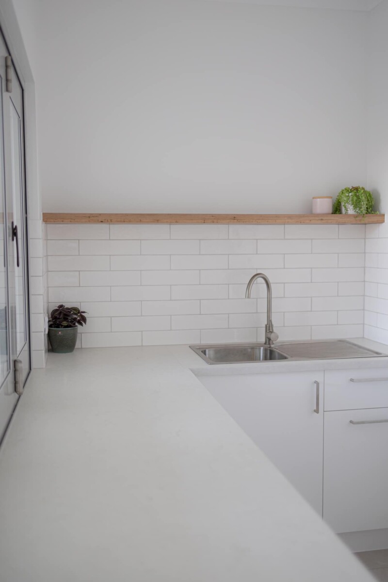 Benchtops: Laminex 'White Valencia' Natural Finish (Acrylic Edge)