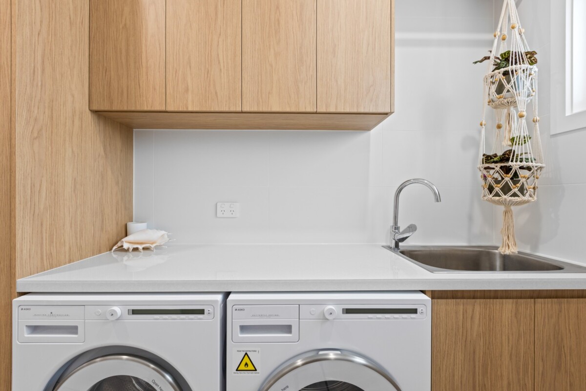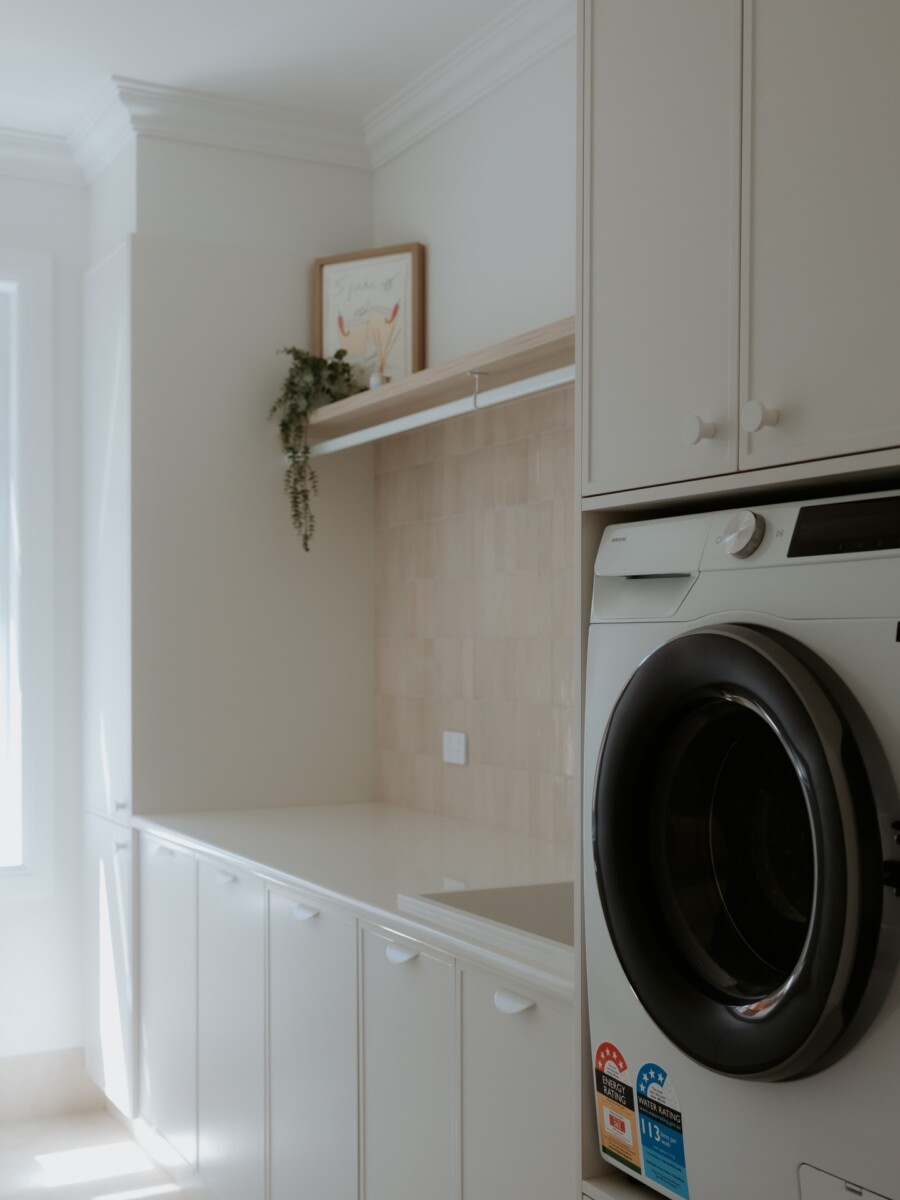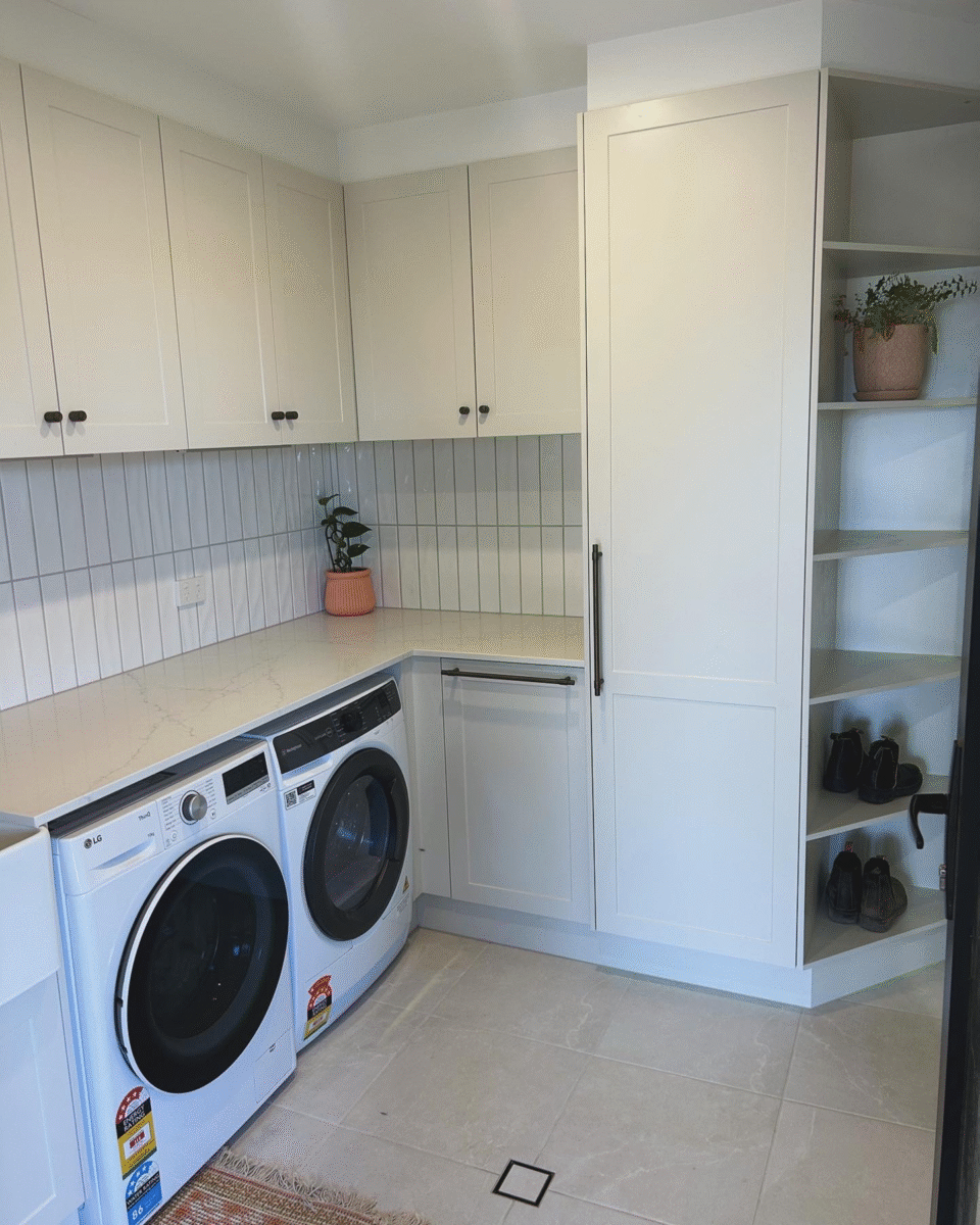 At the heart of this Laundry is a Butler’s sink—deep, wide, and practical. Its apron-front design brings a classic, country-inspired feel while maintaining a seamless, refined look.